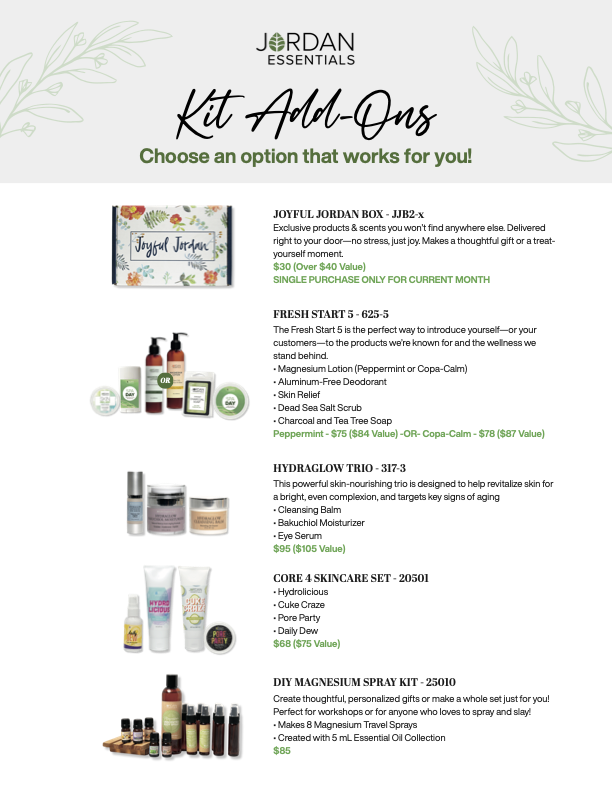 Additionally, you can customize your start as a Jordan Essentials Consultant with our stylized "Journeys” and Add-On Collections: the Health & Wellness Box and Face Care Collections are just a few examples. Each of these add-ons focuses on specific areas to help you build and personalize your business.